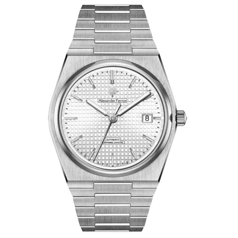 Alexander Ferros 5052S/02 là mẫu đồng hồ dress watch nam thanh lịch, sở hữu vỏ thép mạ bạc, mặt số màu trắng bạc, kết hợp máy Miyota từ Nhật, kính sapphire chống trầy và khả năng chống nước tiêu chuẩn 5 ATM — phù hợp cho việc sử dụng hàng ngày với phong cách sang trọng tối giản.