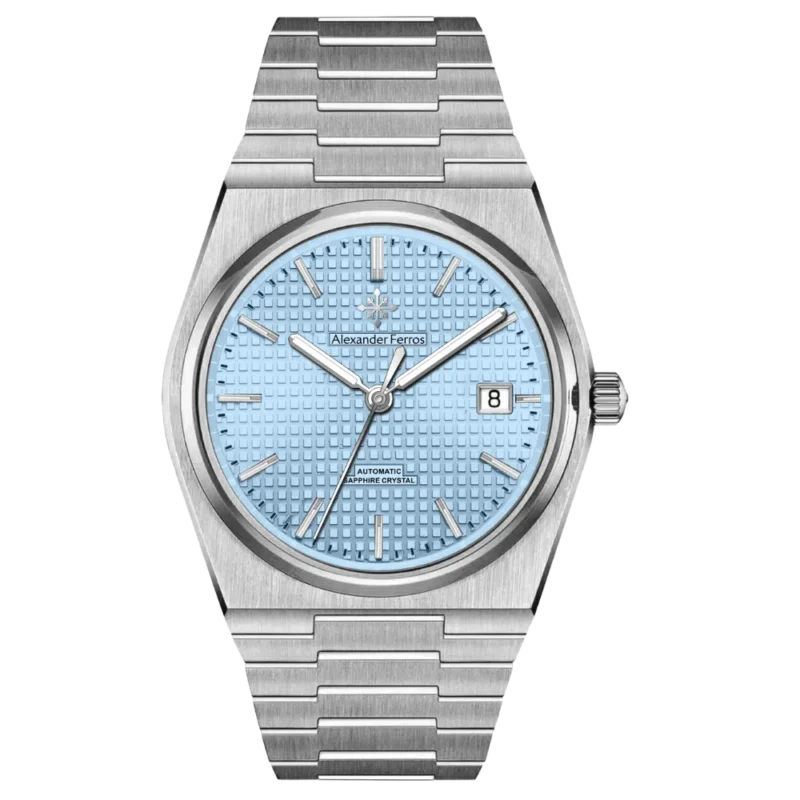 Alexander Ferros 5052S/13 là mẫu đồng hồ dress watch nam thanh lịch, sở hữu vỏ thép mạ bạc, mặt số màu xanh băng, kết hợp máy Miyota từ Nhật, kính sapphire chống trầy và khả năng chống nước tiêu chuẩn 5 ATM — phù hợp cho việc sử dụng hàng ngày với phong cách sang trọng tối giản.
