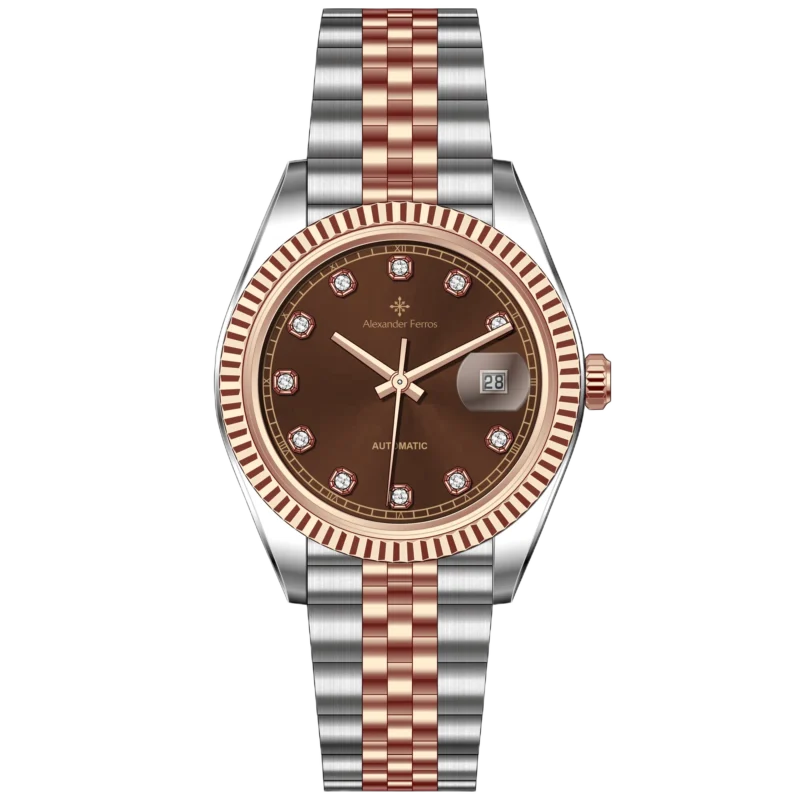 Alexander Ferros 8132D/08 là mẫu đồng hồ cơ nam mang phong cách demi vàng hồng sang trọng, nổi bật với nền Chocolate, đường kính 40mm, vỏ thép không gỉ 316L, mặt kính sapphire chống trầy, và bộ máy automatic Nhật Bản ổn định. Thiết kế phối màu tinh tế giữa vàng hồng và bạc mang lại vẻ ngoài thanh lịch, hiện đại nhưng vẫn cổ điển, phù hợp cho quý ông công sở hoặc những ai yêu thích phong cách đẳng cấp nhẹ nhàng, sang trọng trong từng chi tiết.