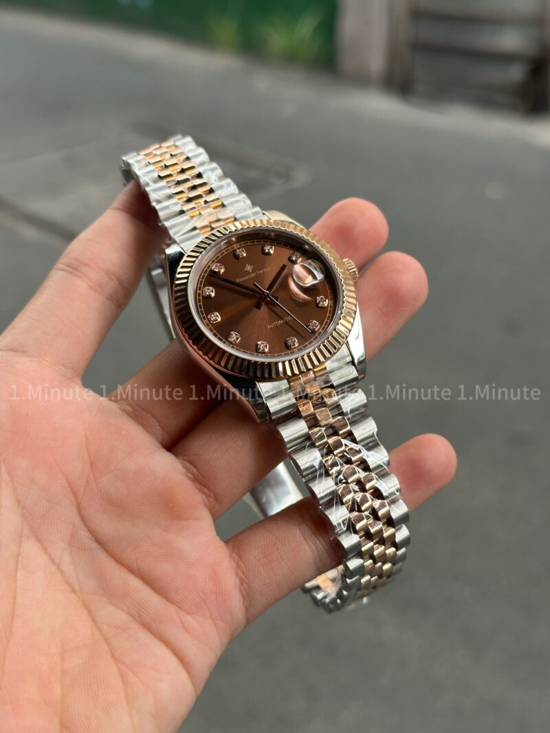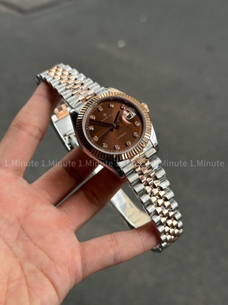 Chất liệu và hoàn thiện là một điểm nhấn khác không thể bỏ qua. Vỏ thép không gỉ 316L vốn là tiêu chuẩn trong ngành để đảm bảo độ bền, chống ăn mòn và chịu lực tốt. Thiết kế demi – phối giữa mạ vàng hồng và thép bạc – mang lại cảm giác sang trọng nhưng vẫn hiện đại, không quá chói lóa mà thanh lịch. Dây đeo kim loại cùng tông hoặc dây demi cũng giúp mẫu này dễ dàng phối với vest, áo sơ mi hoặc trang phục thường ngày nhưng muốn nâng tầm phong cách.