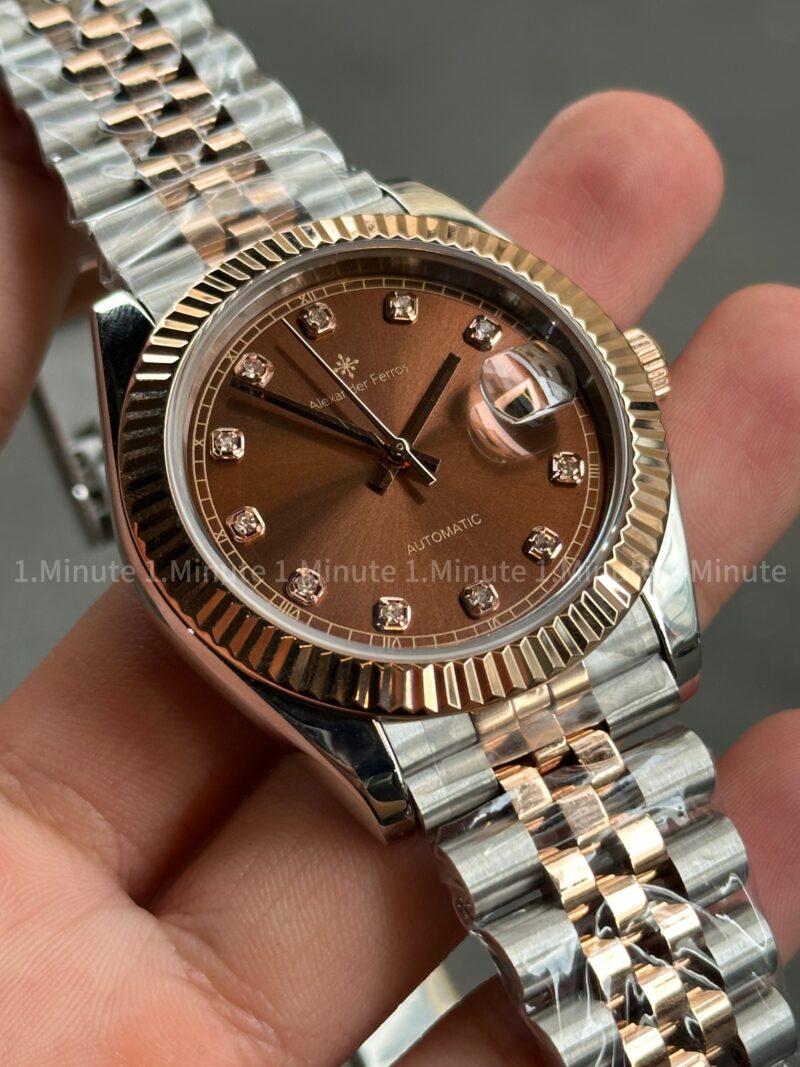 Trong hành trình chọn lựa một chiếc đồng hồ cơ vừa đẳng cấp vừa dễ phối đồ cho môi trường công sở hay các buổi gặp gỡ trang trọng, mẫu 8132D/08 từ thương hiệu Alexander Ferros nổi bật như một ứng viên sáng giá với phong cách dress watch sang trọng, khiến người dùng không chỉ xem giờ mà còn thể hiện gu thẩm mỹ tinh tế. Mẫu đồng hồ này mang trên mình thiết kế demi vàng hồng – tức là phần vỏ và dây kết hợp giữa thép không gỉ mạ vàng hồng và thép bạc, tạo nên điểm nhấn thời thượng nhưng vẫn giữ nét lịch lãm vốn có. Các thông số kỹ thuật của 8132D/08 mà người dùng đánh giá cao gồm vỏ bằng thép không gỉ 316L, đường kính khoảng 40 mm, mặt kính sapphire, khả năng chống nước và bộ máy automatic từ Nhật Bản.