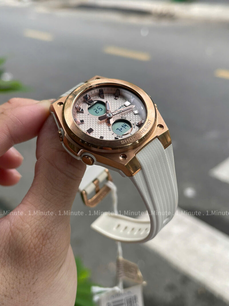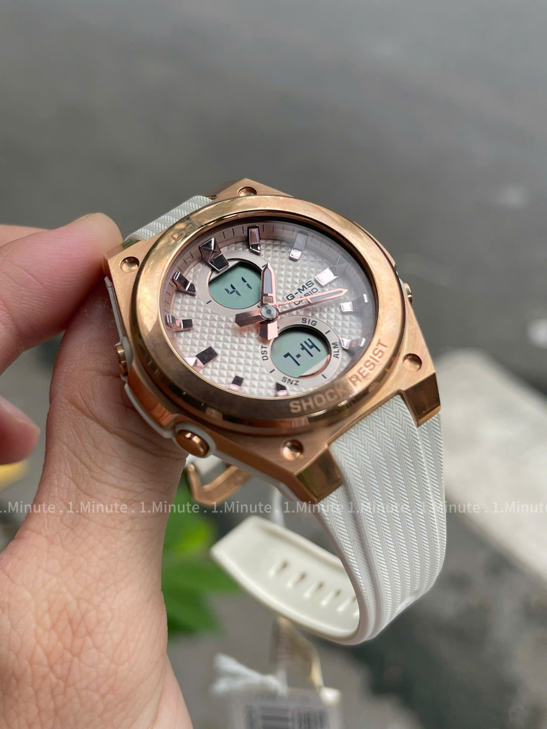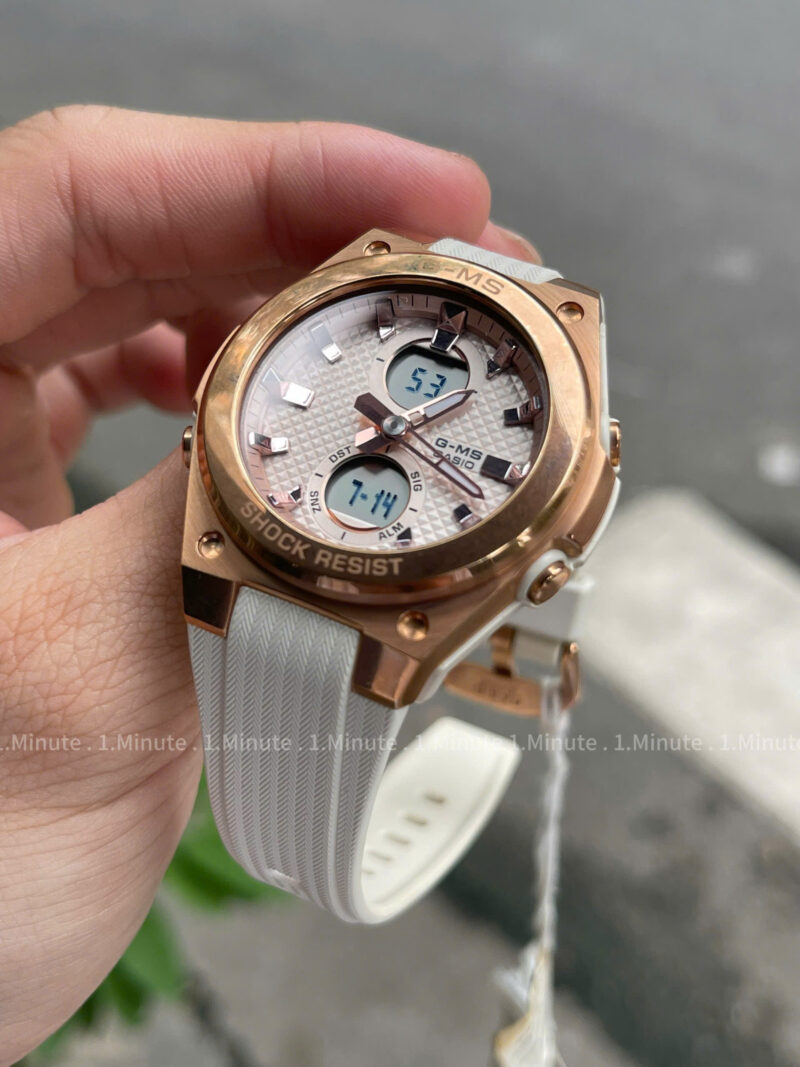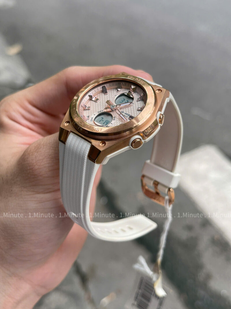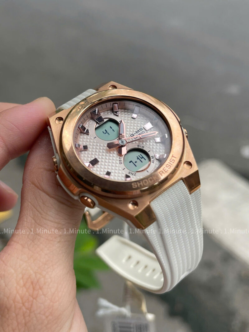 BABY-G MSG-C1000G-7A thuộc dòng G-MS cao cấp của Baby-G, mang phong cách thanh lịch, hiện đại với tone trắng phối viền vàng hồng sang trọng. Thiết kế mặt số kim kết hợp điện tử đầy tinh tế, tích hợp các tính năng tiện ích như giờ thế giới, báo thức, bấm giờ, và chống nước 100 mét. Sử dụng bộ máy tough solar (năng lượng ánh sáng) bền bỉ, mẫu đồng hồ này là sự lựa chọn lý tưởng cho những cô nàng công sở yêu vẻ đẹp tối giản nhưng vẫn mạnh mẽ và tiện dụng.