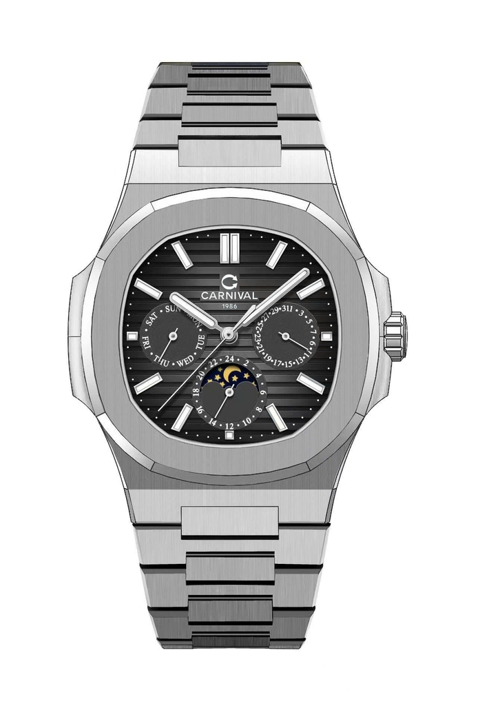 Nếu bạn đang tìm kiếm một mẫu đồng hồ cơ nam có ngoại hình sang trọng, đa tính năng, và mức giá dễ tiếp cận, thì Carnival 1986 8179G-VT-D chính là cái tên xứng đáng để cân nhắc. Với thiết kế nổi bật từ các mặt số phụ hiển thị giờ 24h, thứ, ngày và đặc biệt là chức năng Sun & Moon, mẫu đồng hồ này mang lại vẻ ngoài đậm chất cổ điển pha lẫn nét hiện đại đầy cá tính.