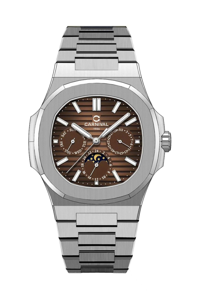 Nếu bạn đang tìm kiếm một mẫu đồng hồ cơ nam có ngoại hình sang trọng, đa tính năng, và mức giá dễ tiếp cận, thì Carnival 1986 8179G-VT-N chính là cái tên xứng đáng để cân nhắc. Với thiết kế nổi bật từ các mặt số phụ hiển thị giờ 24h, thứ, ngày và đặc biệt là chức năng Sun & Moon, mẫu đồng hồ này mang lại vẻ ngoài đậm chất cổ điển pha lẫn nét hiện đại đầy cá tính.