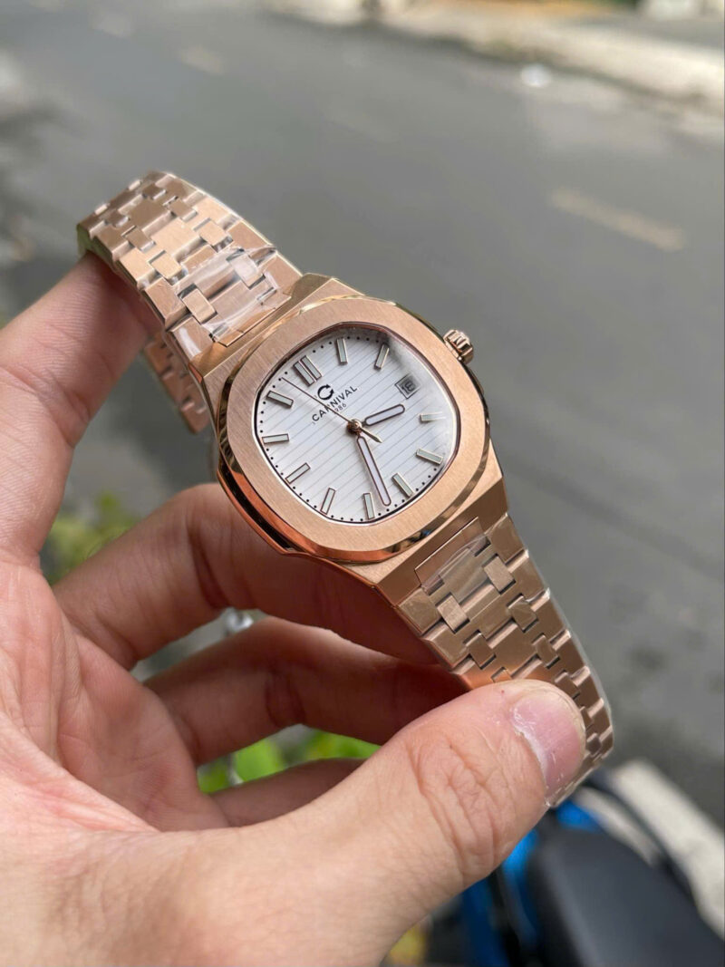 Carnival 8161L-VH-T là mẫu đồng hồ nữ nổi bật với thiết kế tinh tế, kết hợp hài hòa giữa màu trắng và vàng hồng, mang đến vẻ đẹp sang trọng và hiện đại. Với đường kính mặt số 34mm, chiếc đồng hồ này phù hợp với cổ tay nhỏ nhắn của phụ nữ, tạo nên điểm nhấn thanh lịch mà không quá phô trương.