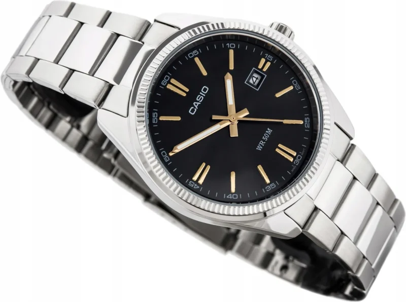 Casio MTP-1302D-1A2V thuộc dòng MTP-1302 vốn đã quá quen thuộc với người yêu đồng hồ phổ thông. Tuy nhiên, điểm khác biệt của phiên bản này nằm ở sự phối màu đặc biệt: mặt đen kết hợp cọc số và kim phủ tông vàng kim.