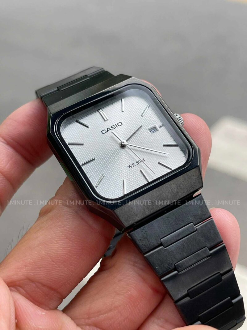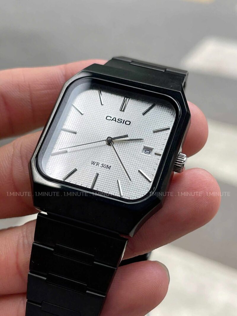 Điểm nổi bật đầu tiên của Casio MTP-B185B-7A nằm ở phần mặt số màu trắng tinh khôi, kết hợp cùng cọc số và kim giờ dạng stick mảnh mai, phủ tông bạc hài hòa với dây và vỏ đen mạ PVD. Logo Casio được đặt gọn gàng ở vị trí 12 giờ, trong khi ô lịch ngày nằm ở vị trí 3 giờ giúp người đeo thuận tiện theo dõi thời gian.