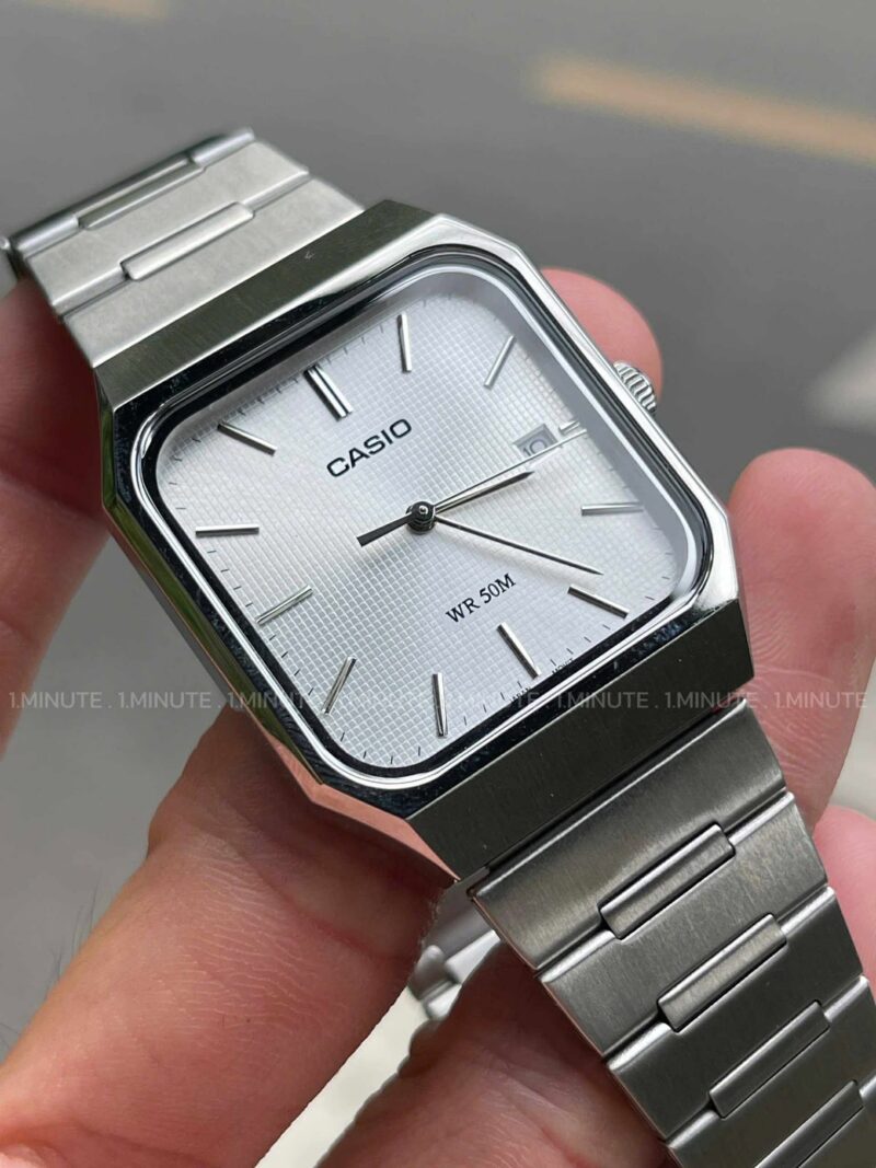 Điểm nổi bật đầu tiên của Casio MTP-B185D-7A nằm ở phần mặt số màu trắng tinh khôi, kết hợp cùng cọc số và kim giờ dạng stick mảnh mai, phủ tông bạc hài hòa với dây và vỏ. Logo Casio được đặt gọn gàng ở vị trí 12 giờ, trong khi ô lịch ngày nằm ở vị trí 3 giờ giúp người đeo thuận tiện theo dõi thời gian.