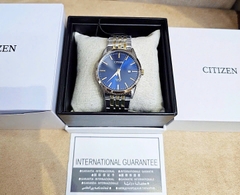 Bộ kim dauphine được vát cạnh sắc nét, đi cùng các cọc số dạng vạch thẳng thon gọn, giúp tăng độ thanh thoát cho mặt đồng hồ. Logo Citizen và ô lịch ngày tại vị trí 3 giờ được bố trí gọn gàng, tạo sự cân đối và hài hòa cho tổng thể.