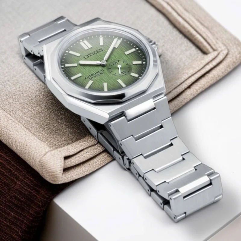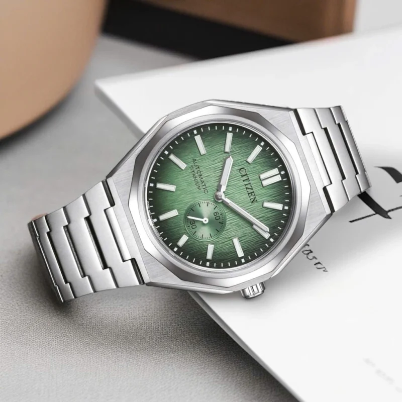 Citizen NJ0180-80X nổi bật với thiết kế tối giản, hiện đại và chất liệu Super Titanium™ độc quyền, đồng thời chống xước và ăn mòn vượt trội. Với mặt số xanh lá cùng các chi tiết bạc sáng, sản phẩm mang đến vẻ ngoài thanh lịch và sang trọng.