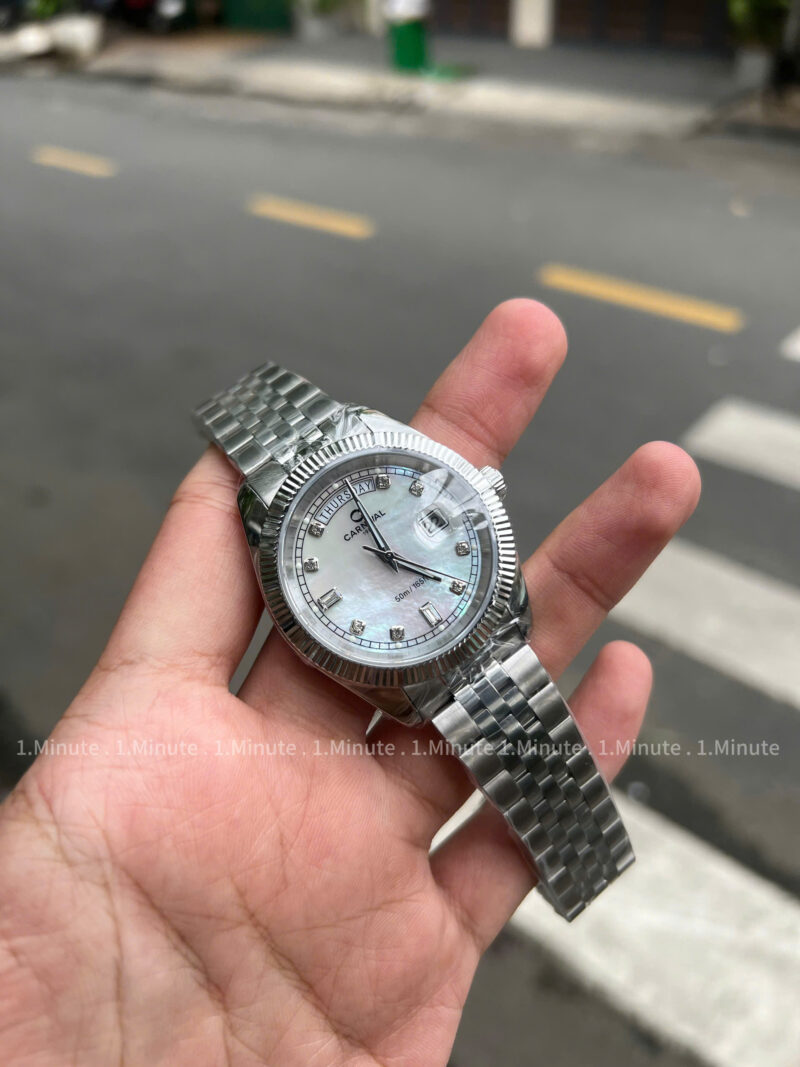 Điểm nhấn đặc biệt của Carnival 8190G-VT-WHITE MOP chính là mặt dial làm từ chất liệu xà cừ tự nhiên – một chất liệu cao cấp thường xuất hiện ở những mẫu đồng hồ sang trọng. Bề mặt xà cừ phản chiếu ánh sáng theo nhiều sắc độ khác nhau, tạo hiệu ứng ánh sáng mềm mại và quyến rũ ở mọi góc nhìn. Trên nền dial đó là hệ thống cọc số dạng vạch mảnh, được phủ lớp dạ quang nhẹ, hỗ trợ quan sát trong điều kiện ánh sáng yếu. Bộ kim dauphine được vát cạnh sắc nét, nổi bật trên nền trắng ngà của xà cừ, mang đến sự hài hòa và thanh thoát. Ngoài ra, cửa sổ lịch ngày vẫn được đặt gọn tại vị trí 3 giờ như những phiên bản cùng dòng, giữ bố cục cân đối và dễ theo dõi.