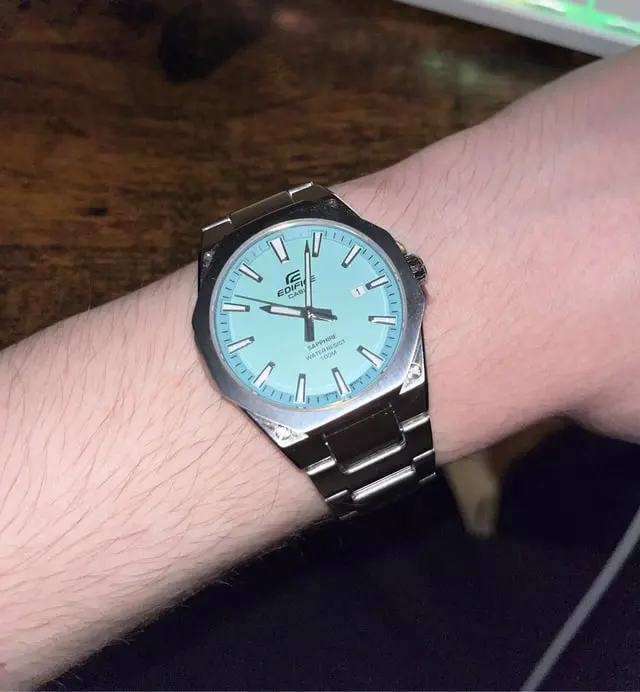Khi đeo EFR-S108D-2BVUDF, cảm giác đầu tiên chính là sự nổi bật. Mặt số Tiffany Blue thu hút ánh nhìn ngay lập tức, đặc biệt khi ánh sáng chiếu vào tạo hiệu ứng lung linh.