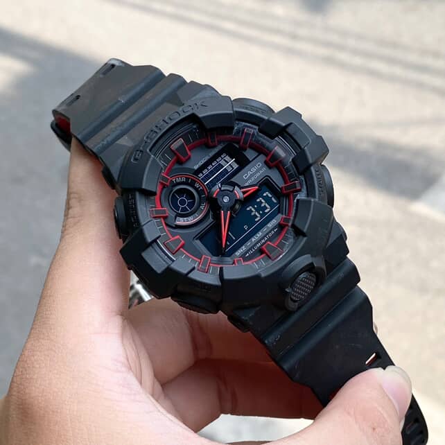 Casio G-Shock GA-700SE-1A4DR nổi bật với thiết kế hầm hố, phối màu đen đỏ cá tính cùng bộ vỏ chống sốc cực kỳ chắc chắn. Mẫu đồng hồ này kết hợp giữa kim và điện tử, trang bị đầy đủ các tính năng như bấm giờ, đếm ngược, báo thức, đèn LED siêu sáng và khả năng chống nước 200M. Lý tưởng cho những ai yêu thích phong cách thể thao, mạnh mẽ và năng động.