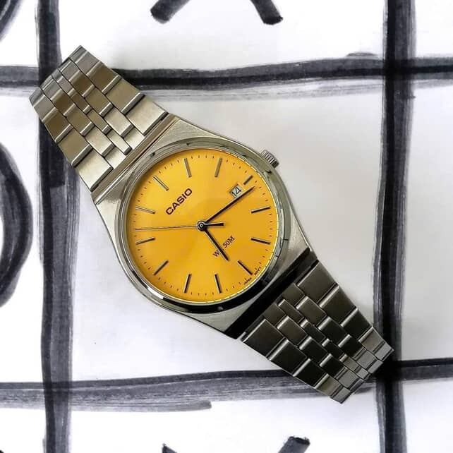 Chiếc đồng hồ này là một phần trong bộ sưu tập MTP-B145D – dòng sản phẩm nổi bật của Casio với phong cách thiết kế “minimalist” (tối giản). Và trong khi các mẫu đồng hồ khác thường chọn mặt số màu trắng, đen hoặc xanh truyền thống, MTP-B145D-9AV lại chọn một hướng đi riêng với tone vàng chanh nhẹ nhàng – một sắc vàng pastel rất hiện đại, tạo cảm giác trẻ trung, lịch lãm mà không hề quá sặc sỡ hay rực rỡ như vàng kim.