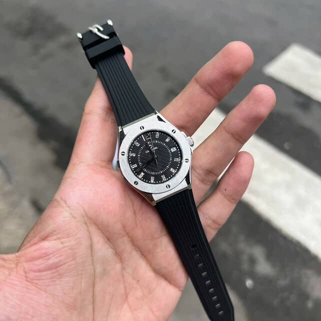 Ngay từ cái nhìn đầu tiên, mẫu đồng hồ gây ấn tượng với sự phối hợp giữa mặt số đen sâu đầy huyền bí và dây cao su đen cao cấp, ôm sát cổ tay mang lại cảm giác thể thao và năng động. Phần viền thép bạc không gỉ sáng bóng bao quanh giúp tổng thể đồng hồ trở nên cân bằng, tạo độ sáng cho toàn bộ thiết kế, không bị chìm trong gam màu tối. Đây là sự kết hợp hoàn hảo giữa cá tính mạnh mẽ và sự thanh lịch nền nã – rất phù hợp với những cô nàng yêu thích phong cách “urban chic” hiện đại.
