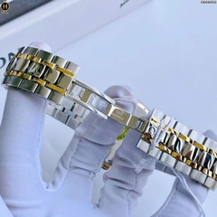 Toàn bộ phần vỏ đồng hồ được làm từ thép không gỉ mạ vàng công nghệ PVD, có độ bền cao, chống ăn mòn và giữ độ sáng bóng lâu dài. Viền bezel được xử lý bóng, tạo nên sự phản chiếu tinh tế khi gặp ánh sáng, trong khi thân vỏ giữ kiểu dáng tối giản, liền mạch với càng dây.