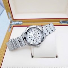 Mẫu SNZJ03J1 sở hữu mặt số màu trắng tinh tế nam tính kết hợp các cọc số và kim lớn phủ dạ quang LumiBrite, giúp dễ dàng quan sát giờ ngay cả trong điều kiện thiếu sáng. Vòng bezel xoay đơn hướng với tông bạc – đen nổi bật, hỗ trợ tính năng đo thời gian lặn hoặc bấm giờ thể thao.