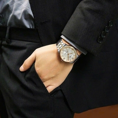Vỏ đồng hồ chế tác từ thép không gỉ cao cấp, đường kính 42mm và độ dày 10.9mm, cân bằng giữa sự mạnh mẽ và thanh lịch. Dây thép demi hai tông màu với khóa bấm tiện lợi vừa chắc chắn, vừa mang lại cảm giác thoải mái khi đeo cả ngày.