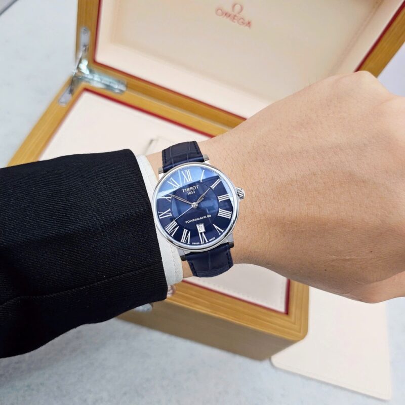 Tissot Carson Premium Powermatic 80 T122.407.16.043.00 là chiếc đồng hồ dress watch hoàn hảo, kết hợp vẻ ngoài tinh tế với công nghệ mạnh mẽ. Mặt số xanh navy sang trọng tinh xảo với họa tiết guilloché, đi kèm bộ kim feuilles và cọc số La Mã cổ điển. Vỏ thép không gỉ 316L đường kính 40 mm, kính sapphire cong chống trầy xước, dây da xanh trẻ trung. Trái tim vận hành là bộ máy Powermatic 80 trữ cót 80 giờ, dây da cao cấp, nắp đáy lộ máy và khả năng chống nước đến 50 mét — tổng hòa giữa vẻ đẹp, độ bền bỉ và độ chính xác Thụy Sĩ.